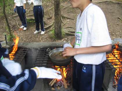 2日目の野外炊飯は好天に恵まれ、班ごとに協力してカレーを作りました。どの班も悪戦苦闘しながらもおいしいカレーができました。最後の片づけも立派だったので、施設の職員の方からお褒めの言葉もいただきました。