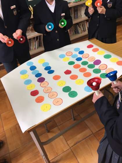 ハンドベルと同じ色になるよう、音階で色を変えています。