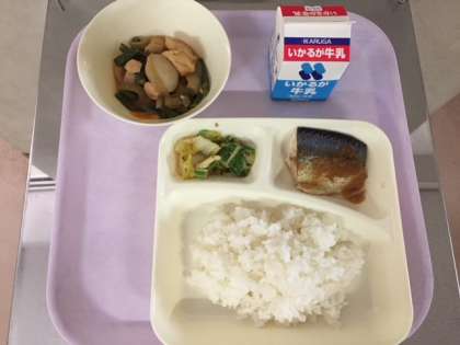 【さばのおろしじょうゆかけ・一口がんもとさといものみそ煮・白菜のごまあえ・ごはん・牛乳】