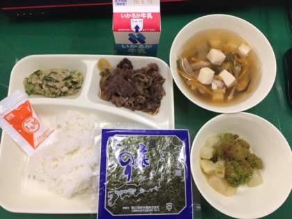 【手巻きご飯(牛肉の甘辛煮・ツナソテー)・すまし汁・和なしの抹茶クランブル・牛乳】