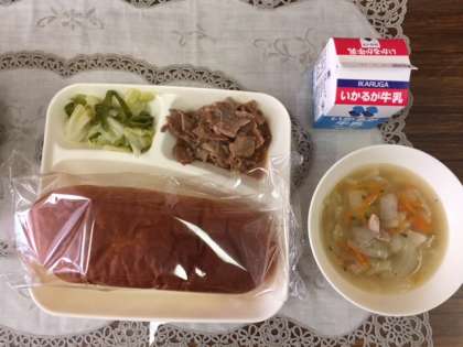 【豚肉のデミグラスソース・スープ・キャベツとピーマンのソテー・パンプキンパン・牛乳】