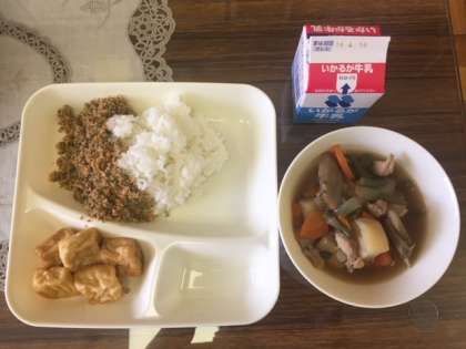 【鶏肉とじゃがいもの煮もの・あつあげのしょうゆだれかけ・紅ざけそぼろ・ごはん・牛乳】