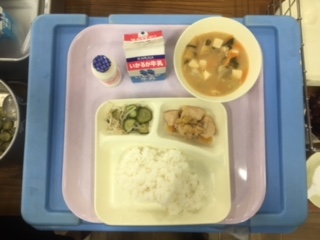 【焼き鳥 味噌汁 胡瓜ともやしの柚子あ え 発酵乳 ご飯 牛乳】