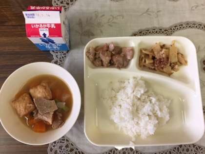 【鶏肉のてり焼き・じゃがいもとあつあげの煮物・ごまかかいため・ごはん・牛乳】