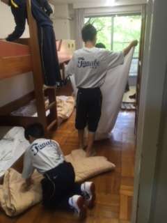 さあ寝具の整理です。もとどおりたためるでしょうか。