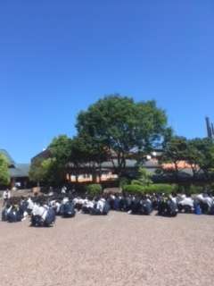 これ以上ない晴天のもと、野外炊飯の説明を聞いています。美味しいカレーが作れますように。あとケガもないようにね。