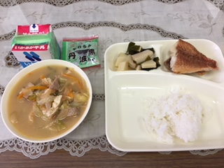 【赤魚のしょうゆだれかけ・みそ汁・わかたけ煮・ソフト黒豆・ごはん・牛乳】