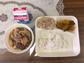 【すき焼きに(ふ)・焼きかぼちゃの甘みつかけ・もやしのごま酢あえ・ごはん・牛乳】