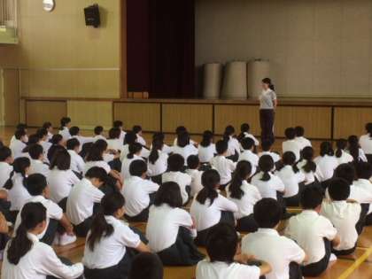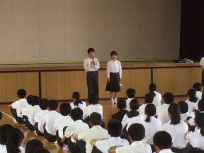 本日、1年生の学年集会では先日行われた生徒専門委員会での目標や活動の報告と体育大会に関するお話がありました。