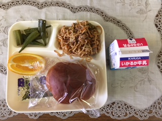 【焼きそば・オクラの中華あえ・オレンジ・パン・牛乳】