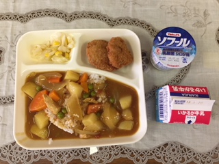【チキンカレーライス・一口トンカツ・キャベツとコーンのサラダ・ヨーグルト・牛乳】