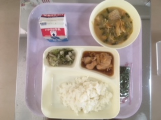 【鶏肉の甘辛焼き みそ汁 焼きのり キャベツの赤じそあえ 米飯 牛乳】