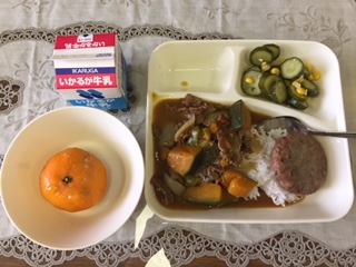 【夏野菜カレーライス・焼きハンバーグ・きゅうりとコーンのサラダ・みかん(冷)
