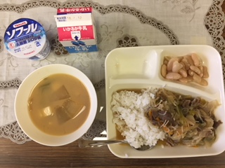 【牛丼・とうがんのみそ汁・大福豆の煮もの・ヨーグルト・牛乳】