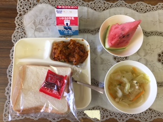 【かぼちゃのグラタン・スープ・すいか・食パン・イチゴジャム・牛乳】