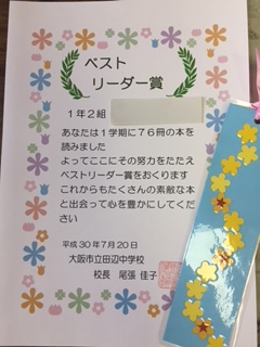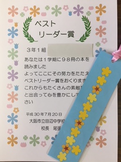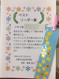 1学期、図書室の本をたくさん読んだベスト リーダーに賞状伝達と元気アップコーディネーターさんが作ってくださったしおりを渡しました。