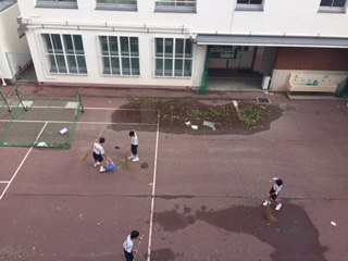 そんな中、飛び散った葉っぱや枝、その他のごみ類を先生と一緒に生徒たちが一生懸命清掃してくれています! 本当にありがとうm(__)m