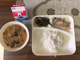 【豚肉の甘辛煮・みそ汁・オクラのおかかいため・ご飯・牛乳】