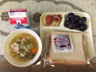 【鶏肉とてぼ豆のスープ・じゃがいもとトマトのチーズ焼き・ぶどう(巨峰)・食パン・牛乳】