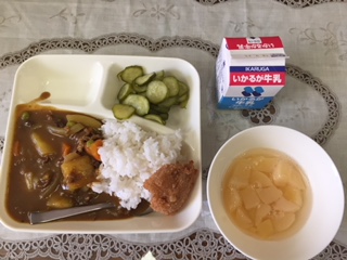 【ビーフカレーライス(米粉)・一口ヒレカツ・きゅうりのピクルス・白桃(カット)】
