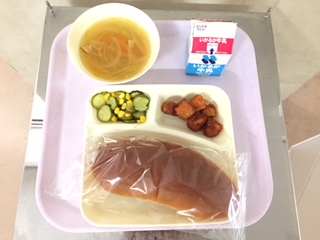 【まぐろのオーロラ煮・スープ・きゅうりとコーンのゆずドレッシング・パン・牛乳】