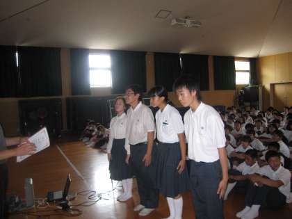 今日の5限に学年集会があり、その場で先日の群読コンクールの結果が発表されました。1位 5組2班