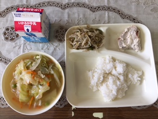 【かつおのマリネ焼き(ノンエッグドレッシング}・マカロニとキャベツのスープ・もやしとピーマンのソテー・ごはん・牛乳】