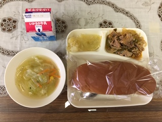 【豚肉と野菜のケチャップソテー・スープ・スイートポテト・パン・牛乳】