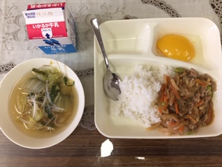 【ピり辛丼・中華スープ・黄桃(缶)】