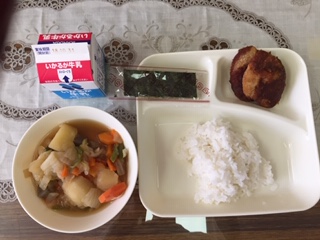 【みそカツ・じゃがいもと野菜の煮物・焼き海苔・ご飯・牛乳】