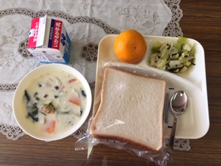 【きのこのクリームスープ・キャベツとひじきのサラダ・みかん・パン・牛乳】