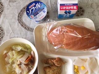 【白身魚のフリッター・スープ煮・大根のピクルス・ヨーグルト・パン・牛乳】