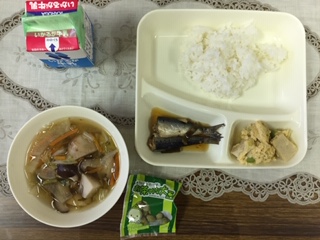【いわしのしょうが煮・うすくず汁・高野豆腐の卵とじ・抹茶大豆・ご飯・牛乳】