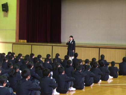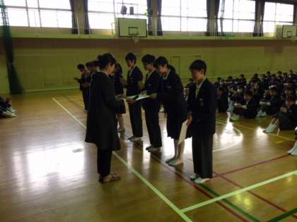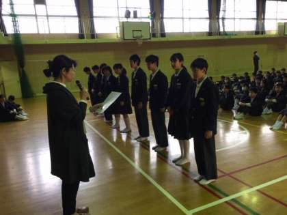 本日の1年生学年集会では生徒専門委員会で決定した目標や活動内容の報告と、百人一首大会での個人成績1位〜10位までの表彰をしました。