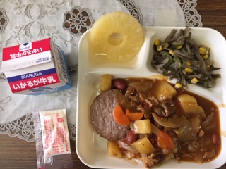 【豚肉と金時豆のカレー・焼きハンバーグ・ごぼうサラダ・パイナップル(缶)・牛乳】