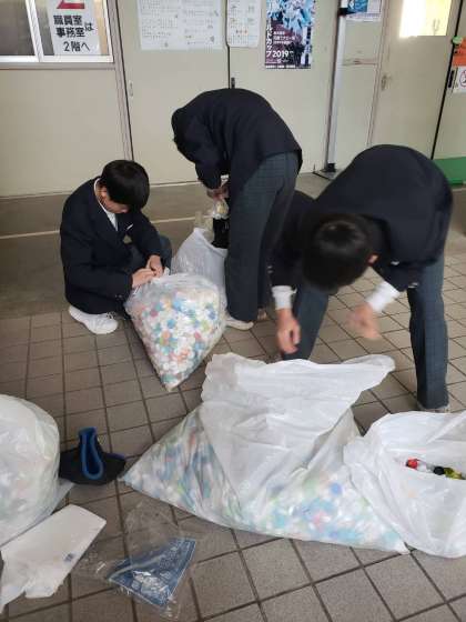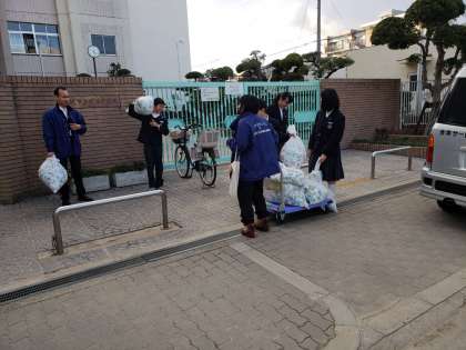 学校で回収しているエコキャップとプルタブを東住吉区社会福祉協議会の方が取りに来てくださいました。