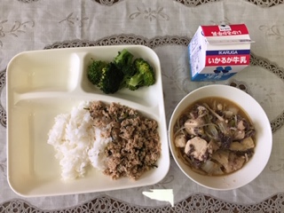 【すき焼き煮(ふ)・ブロッコリーのしょうがづけ・ツナっ葉いため・ごはん・牛乳】
