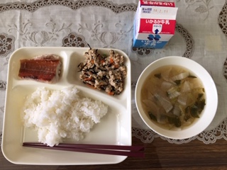 【赤魚のレモンじょうゆかけ・うすくず汁・高野豆腐の炒り煮・ごはん・牛乳】