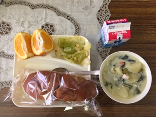 【ほうれん草のクリームシチュー・キャベツのサラダ・いよかん・ブドウパン・牛乳】