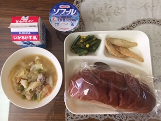 【わかさぎフライ・スープ煮・三度豆とコーンの甘酢和え・ヨーグルト・パン・牛乳】