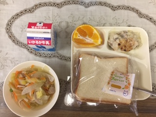 【押し麦のグラタン・スープ・デコポン・食パン・牛乳】
