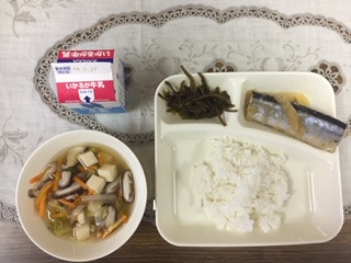 【さんまのみぞれかけ・すまし汁・茎わかめのつくだ煮・ご飯・牛乳】