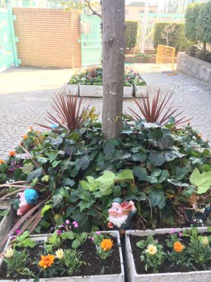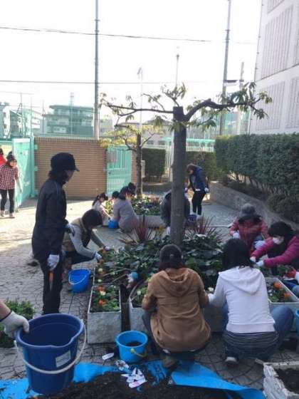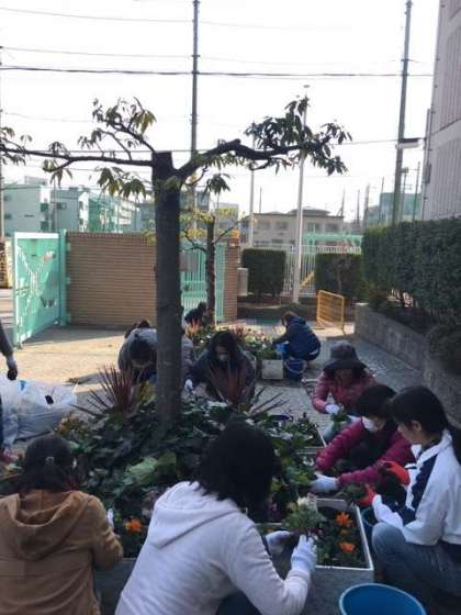 春の訪れを感じる昨日、PTA環境委員の多く皆さまや役員の方々が花の植替えをしてくださいました。