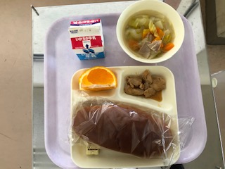 【鶏肉のみそバターソース スープ煮 デコポン パン 牛乳】