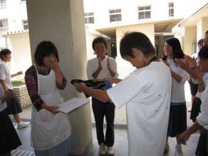 昼休みには「お世話になりました。」と挨拶に来る子も。3年生からは購買のおばちゃんに感謝の色紙が贈られ、涙、涙のお別れとなりました。