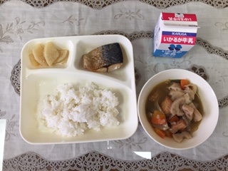 【さばの塩焼き・あつあげと里芋の煮物・大根のみそ煮・ご飯・牛乳】