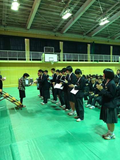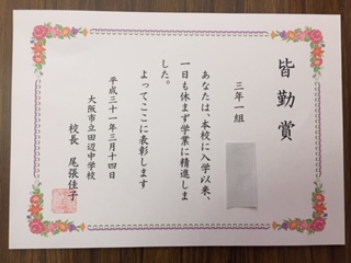 3年間、無遅刻・無欠席の12名の3年生に皆勤賞を渡しました。