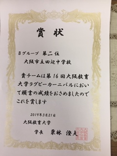 大阪教育大学ラグビーカーニバルに参加し、Bグループ 第2位に輝いたラグビー部に賞状を伝達しました☆