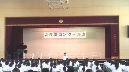 学年代表からの言葉があり、発声練習として校歌を歌い、緊張の中いよいよ1年生の合唱コンクールが始まります。