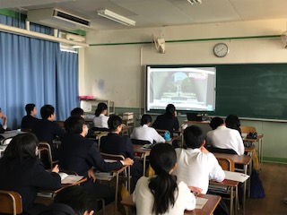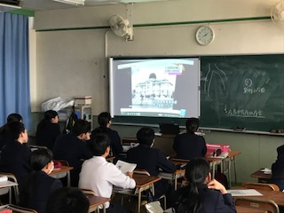 19日(金)の5限、修学旅行に向けて、平和学習を行いました。動画や資料を使って、広島について学びました。